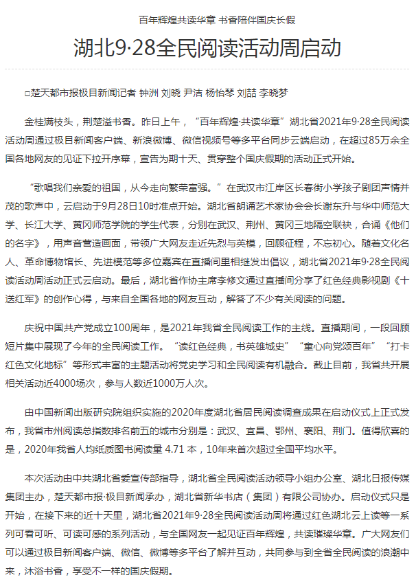 楚天都市报:湖北9.28全民阅读活动周启动,三地隔空合诵《他们的名字》